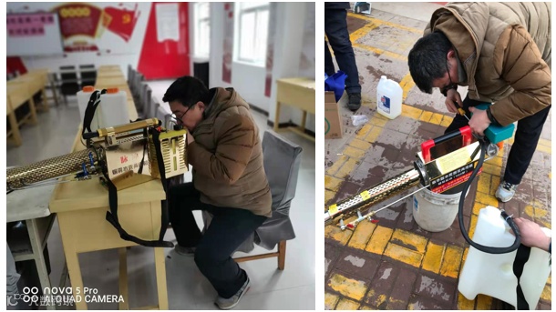 项目经理马英军调试消毒机器,给棉四大院进行彻底的消毒