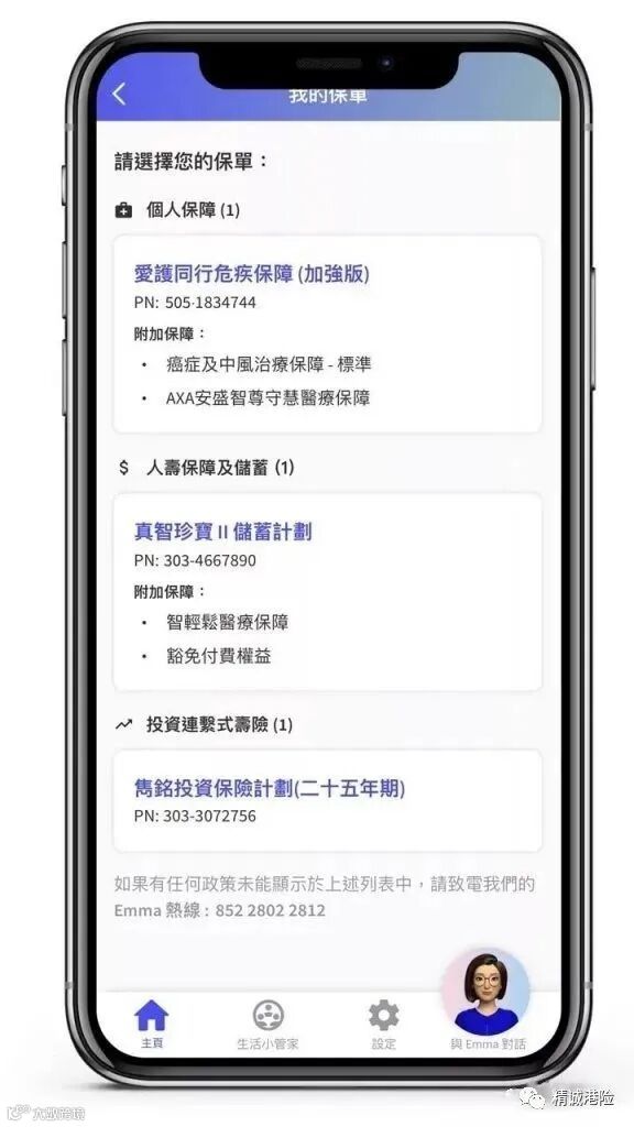 将您的人寿保单添加到 Emma by AXA (注意:只可以添加完成登记手续并已生效的保单。)