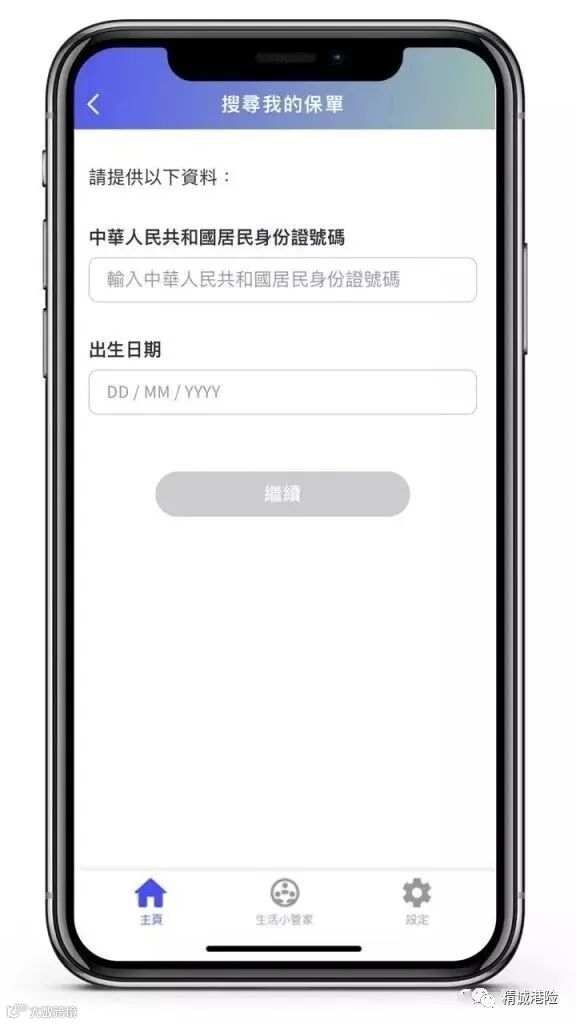 输入身份证号码(香港 / 中国 / 澳门)及出生日期,如果您持有多份人寿保单,只需加入任何一份,其他的亦即会自动显示。