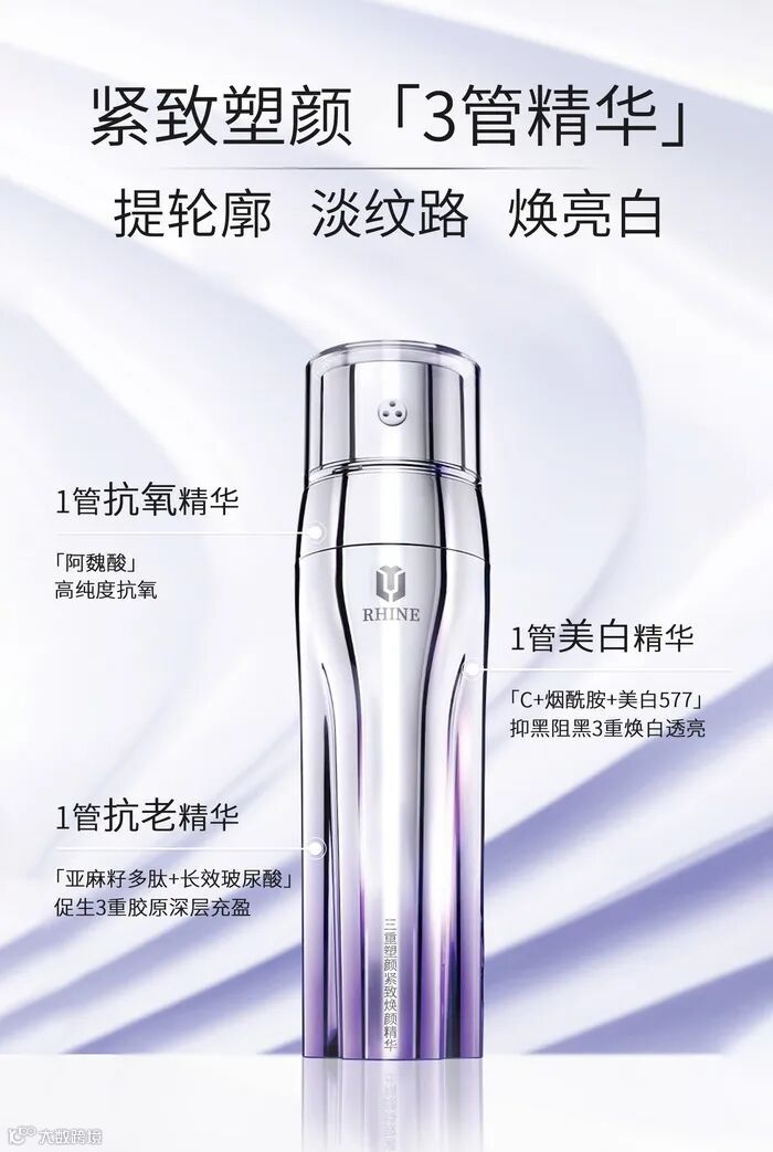 莱茵最近新推出了“三管精华”,集美白、抗老、抗氧化三大功效于一身。通过真空三管包装设计,每管灌装不同的料体,只需要一瓶,就可以实现三大功效,一瓶抵三瓶。
