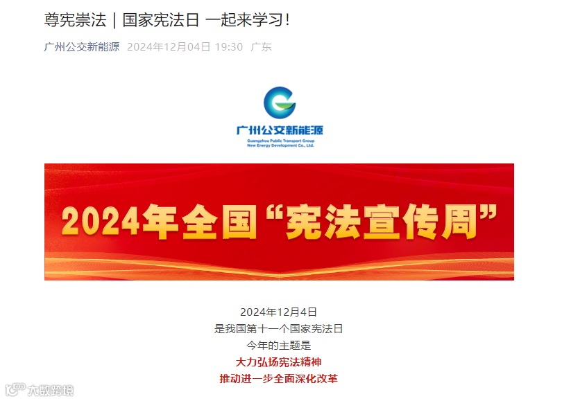 为进一步增强党员干部的法治观念和法治意识,广州公交集团新能源公司于国家宪法日组织公司领导班子、中层干部集中开展法治理论学习,领悟宪法精神实质和核心要义,教育引导领导干部成为国家宪法的坚定信仰者、积极传播者、模范实践者,做到依宪依法依规履职。同时广州公交集团新能源公司充分利用自媒体阵地,转载国家宪法日公益宣传广告,营造企业内外学法普法的积极氛围。