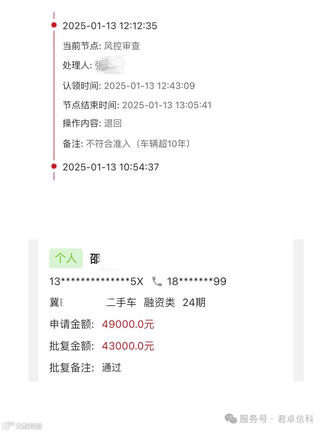 邵先生申请本次业务时,车龄较长超过十年,系统直接拒绝,经过线下复议,重新提交后通过。