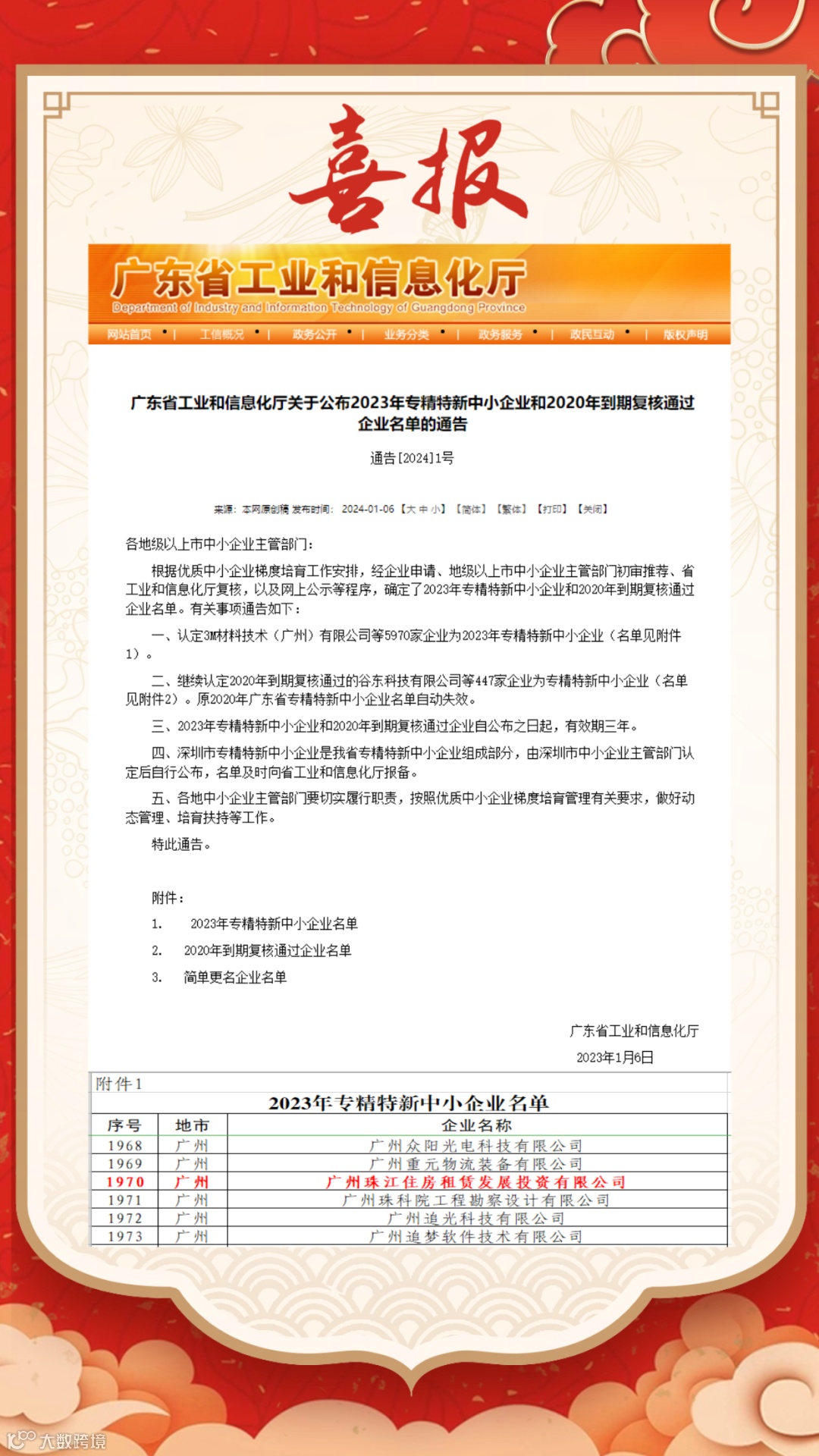 近日,珠江租赁公司获评“2023年广东省专精特新企业”荣誉,展现广东省工信厅对公司专业化、精细化、特色化及创新能力的高度认可,标志公司迈上高质量发展重要新征程。