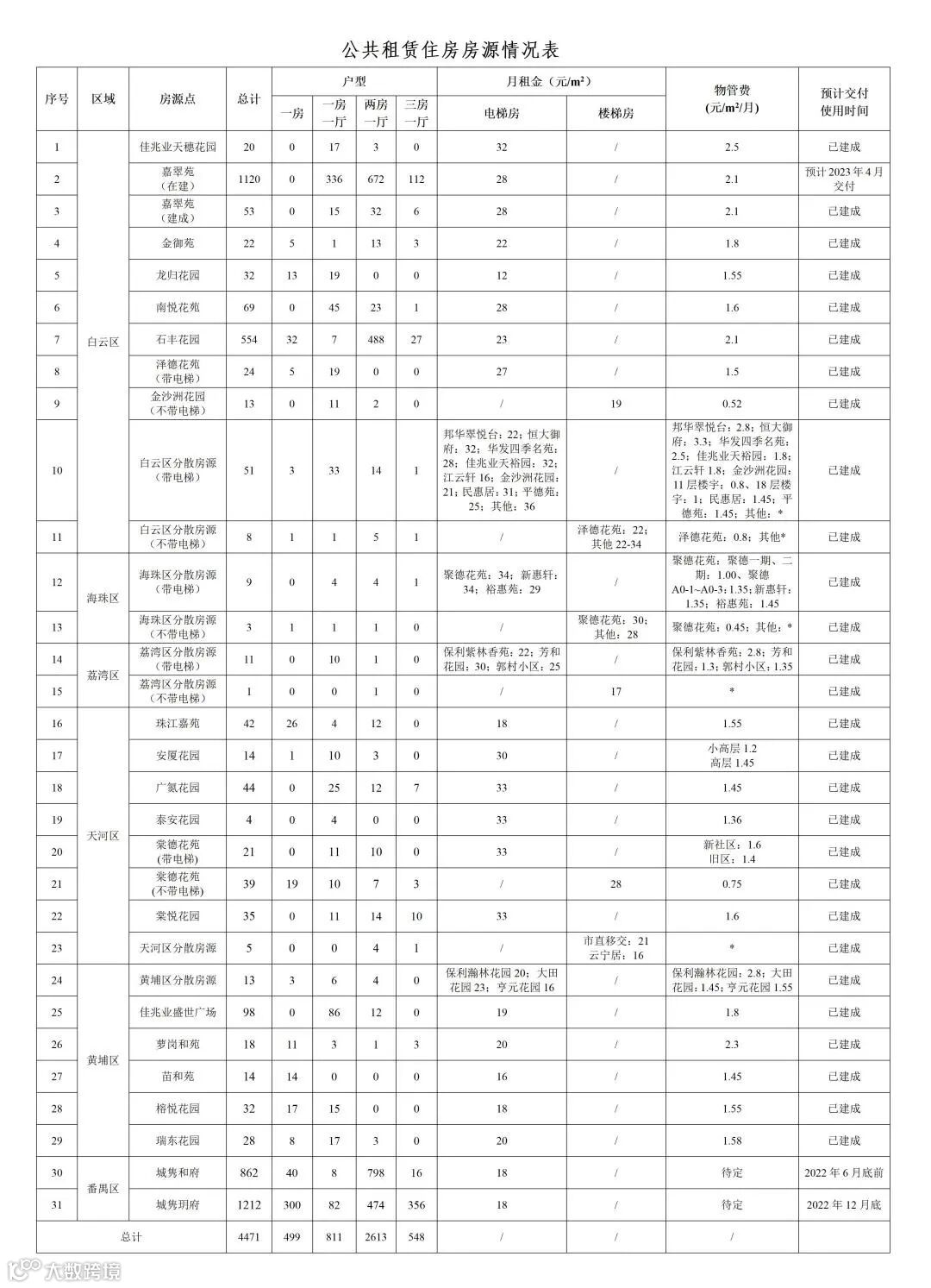 注:各房源租金标准、最新的物管费可查阅《广州市2022年户籍家庭公共租赁住房摇号分配引》。