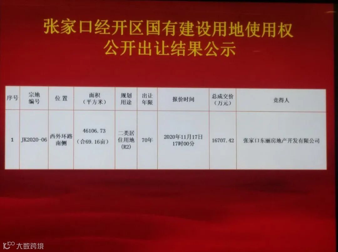 张家口东丽房地产开发有限公司以1.67亿元成功竞得张家口经开区JK2020-06号地。