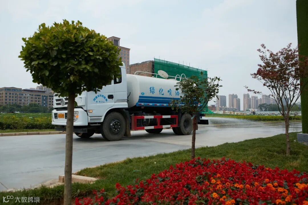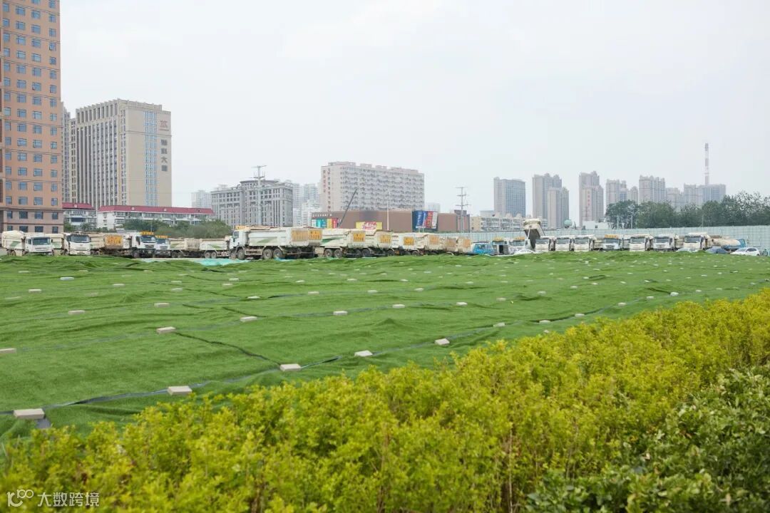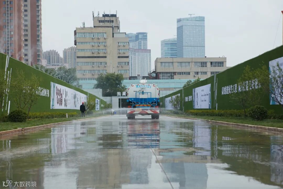 同时,4米高的绿色内围墙上,密集地排放着智能喷雾系统,根据施工现场情况进行智能化喷雾降尘;每天多辆洒水车定期对道路进行洒水降尘,实现100%湿法作业;工地内设置的洗车槽、沉砂池及各类车辆冲洗设备,实现进出车辆 100%冲洗,保证车辆不带泥、运输不抛洒;雾炮机定时开启喷淋;在这一系列的标准化精细建设下,一阵强风吹来,偌大的工地上竟然没有扬起一点尘土。