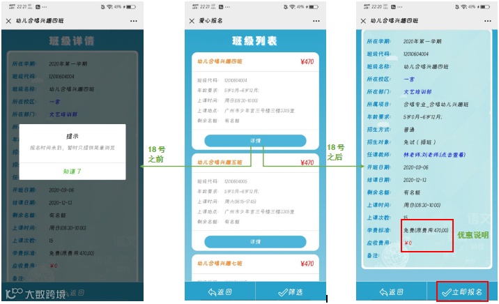 登录系统—关爱课程—立即前往—选择校区—选择报读班级—确认班级信息—点击报名—立即支付—支付成功(支付金额为0),报名完成。