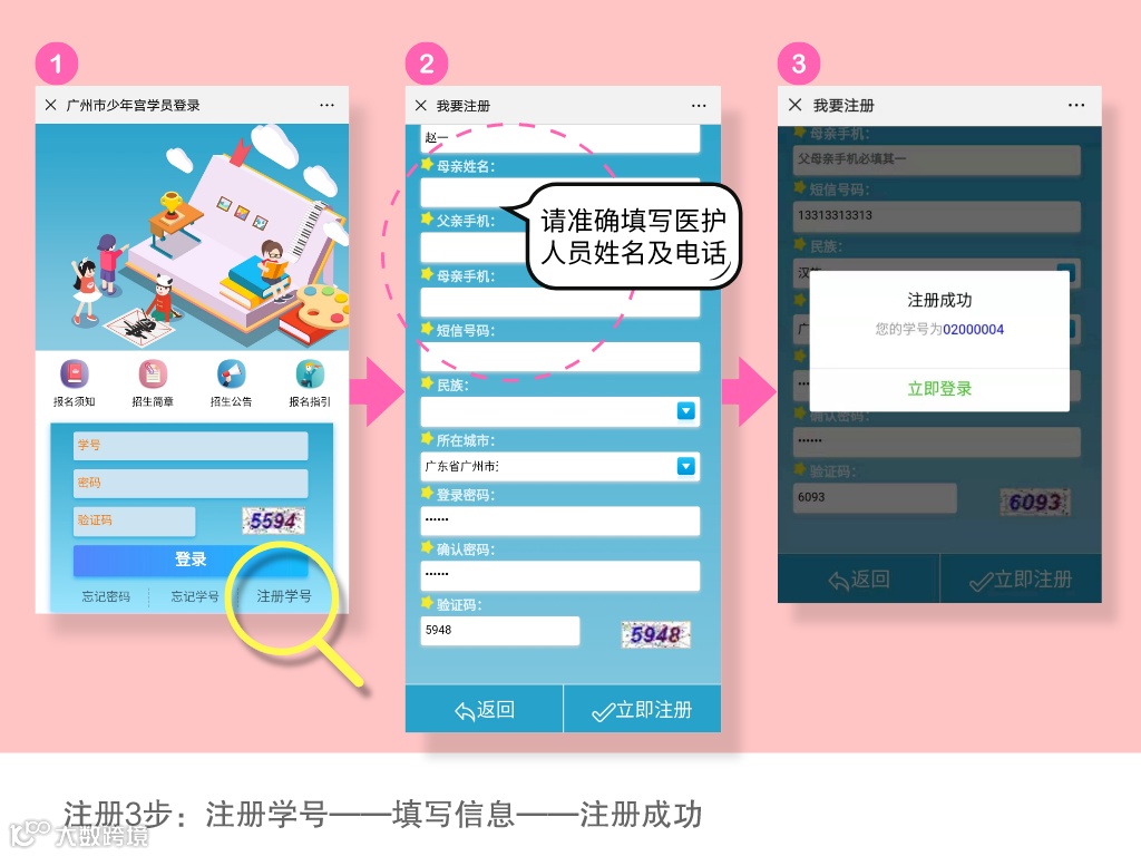 注册时父母资料处请务必准确填写预报名时登记的手机号码。