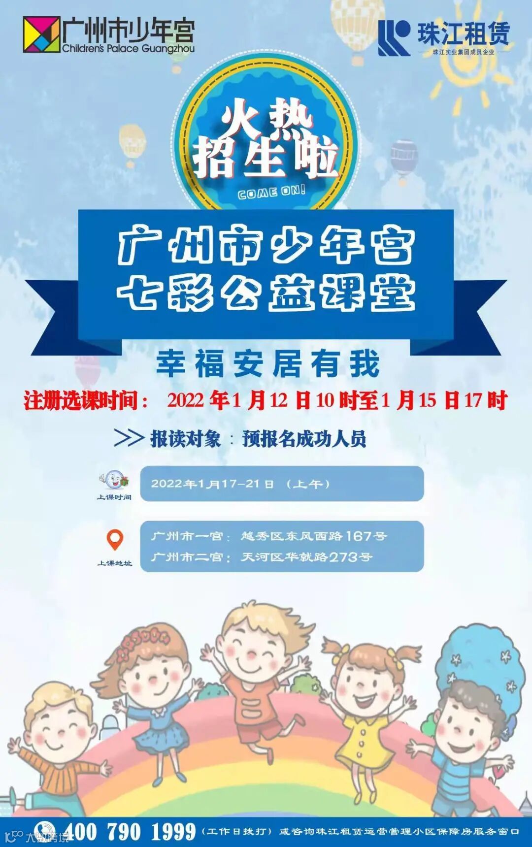 系统将于2022年1月12日10时至1月15日17时开放,请预报名成功的人员,登录广州市少年宫公众号(gzssng)点击“课程信息”—“我的课程”—“关爱课程”进行网上报名,系统会自动匹配适合小朋友年龄的课程。