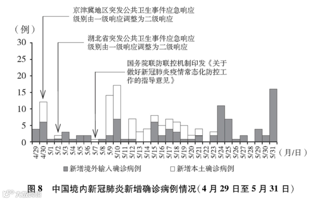全面实行各类场所体温筛查,实行2小时网络直报、12小时反馈检测结果、24小时内完成现场流行病学调查。截至5月31日,全国累计追踪管理密切接触者74万余人。