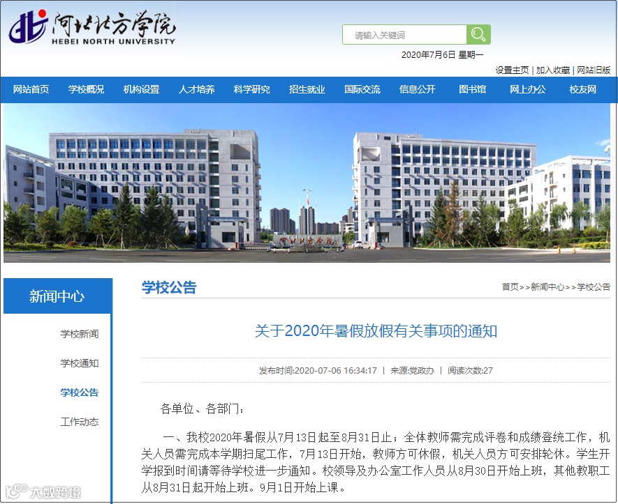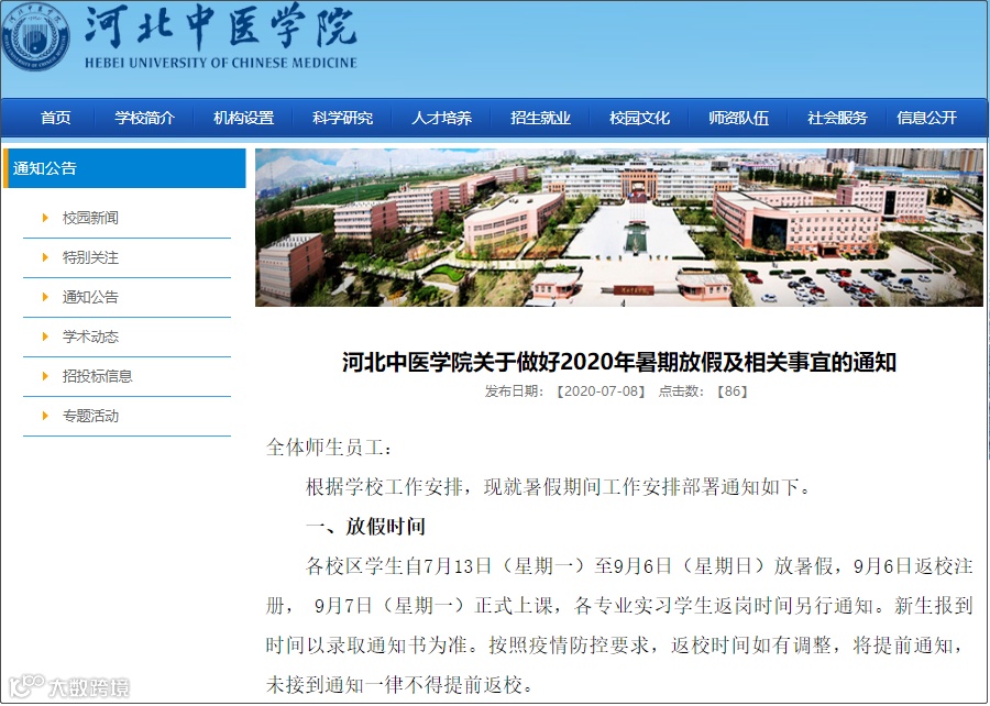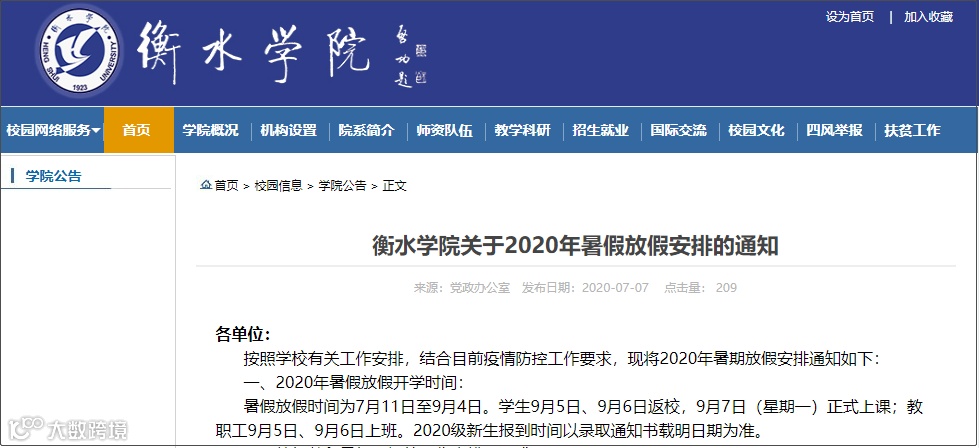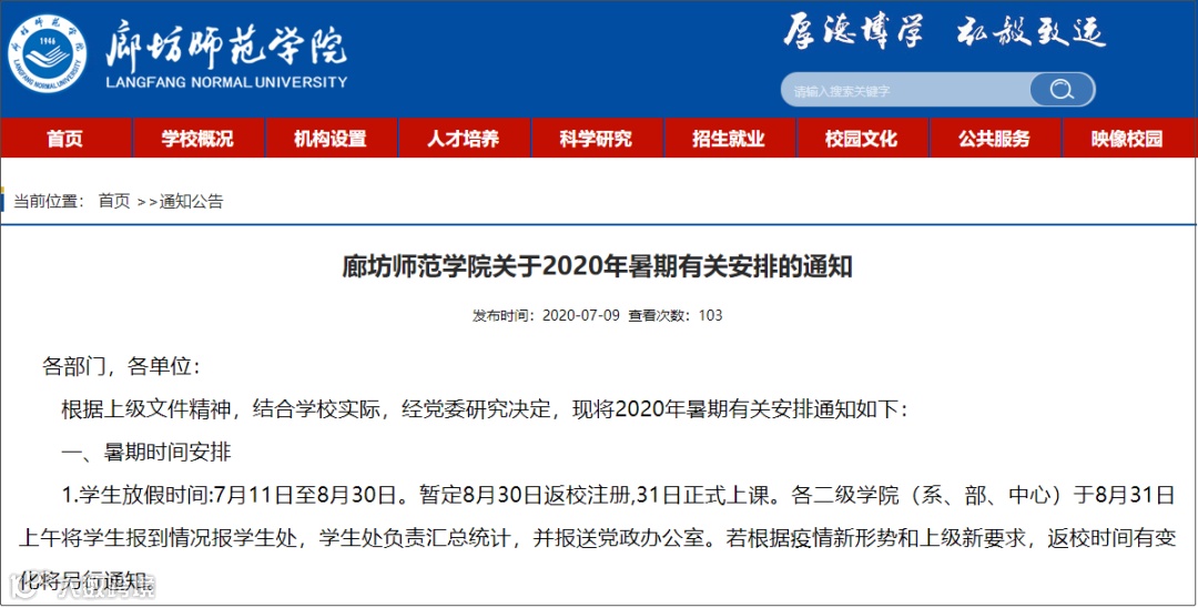 学生放假时间:2020年7月6日—9月11日,9月14日正式上课,具体报到时间根据疫情防控及上级要求另行通知。