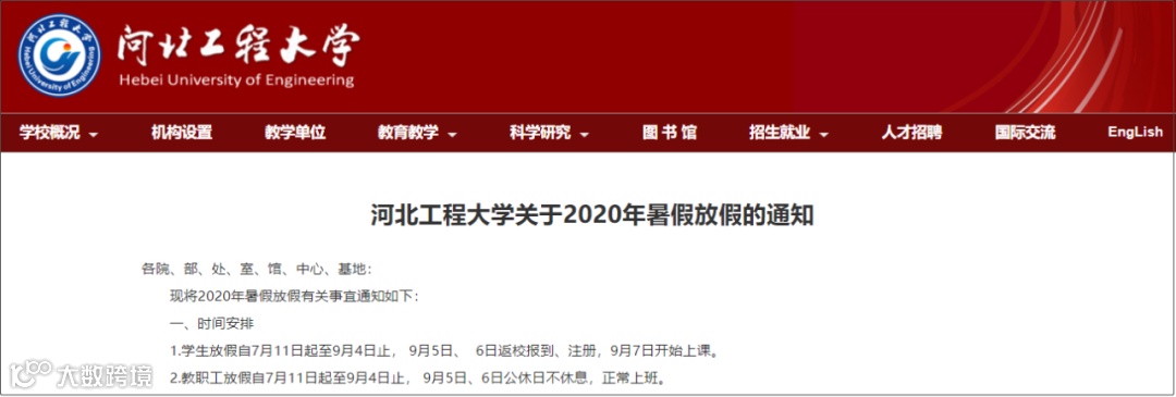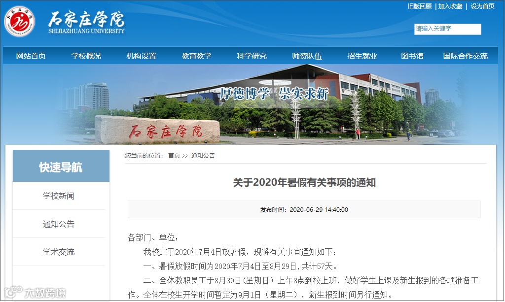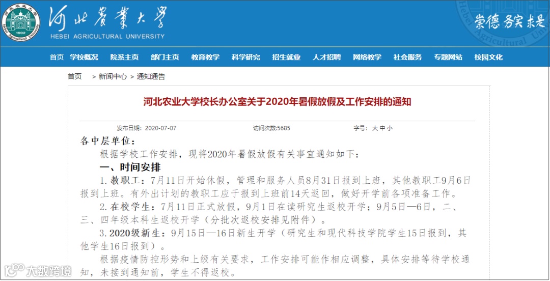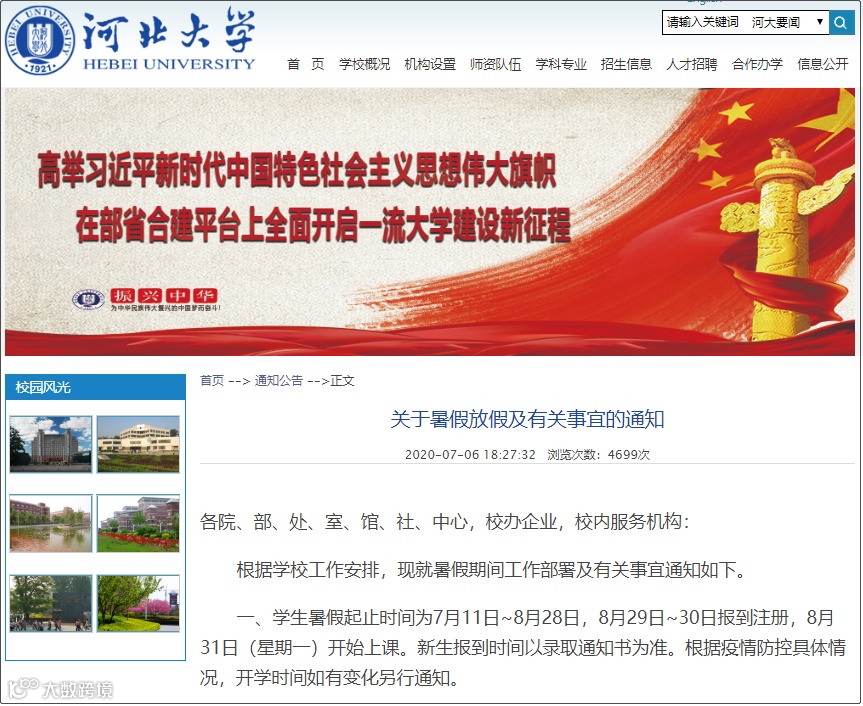 学生放假时间:2020年7月4日~8月30日(暂定)。8月30日(星期日)18:00点前(暂定)返校,8月31日(星期一)正式开课。
