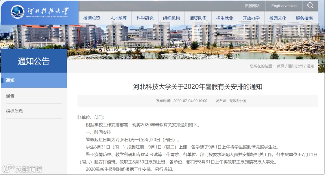学生放假时间:7月11日至8月30日。暂定8月30日返校注册,31日正式上课。各二级学院(系、部、中心)于8月31日上午将学生报到情况报学生处,学生处负责汇总统计,并报送党政办公室。若根据疫情新形势和上级新要求,返校时间有变化将另行通知。