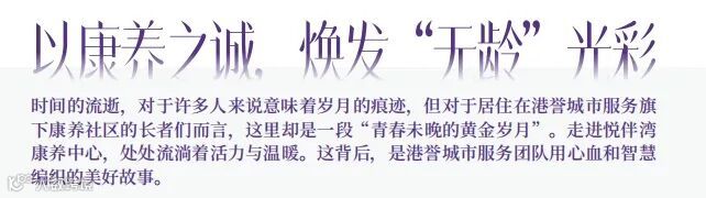 作为一家将“康养服务”作为战略发展核心之一的企业,港誉城市服务不仅仅关注硬件设施的建设,更注重为长者们营造一个充满人文关怀的生活环境。旗下悦伴湾康养中心、长安 99CCRC 康养社区、紫晶悦城社区卫生服务站、港誉国际健康小镇等多个康养项目,将养老、养生、医疗、物联网、文化、旅游等诸多业态融合发展,通过多种多样的文化活动,如书画展、读书会、电影之夜等,还有定期的义诊和健康讲座,为每一位长者创造出了无数充满希望与欢笑的焕活空间。