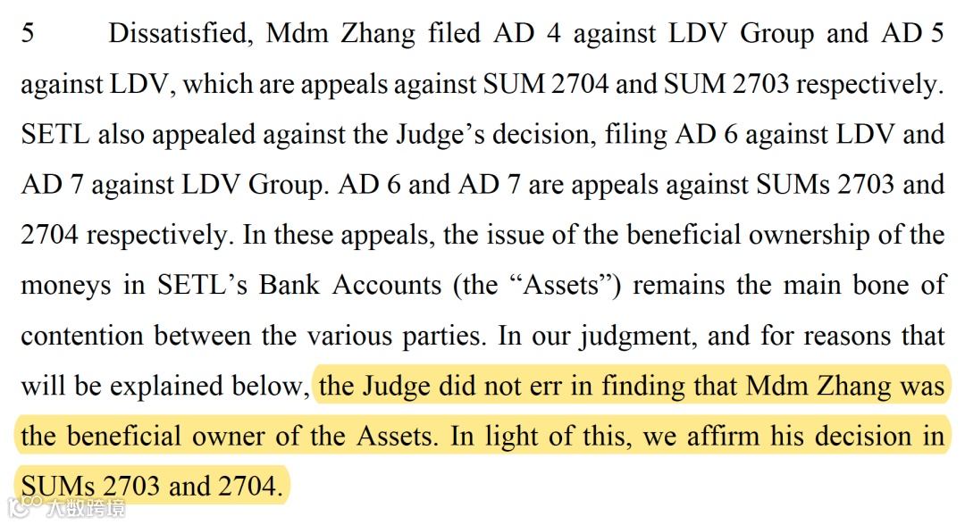 新加坡高等法院认定张兰是其离岸家族信托所在银行账户资产的实际所有人,因此同意了CVC提出的任命接管人的申请;张兰则认为,SETL受益人为她的儿子汪小菲及其子女,这笔钱和张兰无关,所以CVC无权接管。