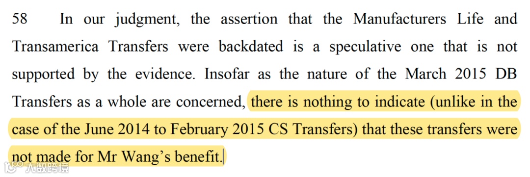 对此,新加坡最高法院判定,向宏利和全美人寿支付的保费,没有证据表明这些交易不是用来保证汪小菲的利益的,所以没有认可CVC的追偿,2亿+人民币保费得以保全。