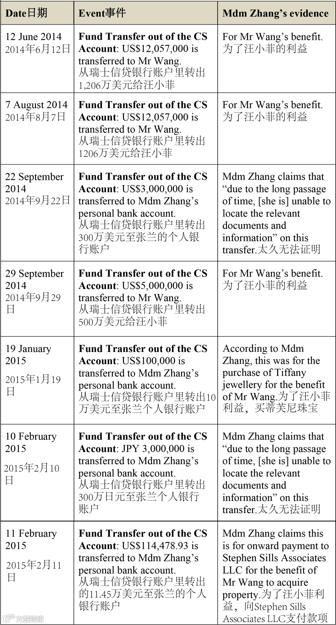 2014年-2015年期间,在没有证据显示受托人发出指令的情况下,张兰指示SETL的瑞信银行账户对外转出7笔资金,其中3笔转给汪小菲、4笔转到张兰的个人账户。有几笔张兰表示无法回忆起转账用途,而法官对这个解释并不买账,认为记不清300万美元巨额转账的用途不符合常理。