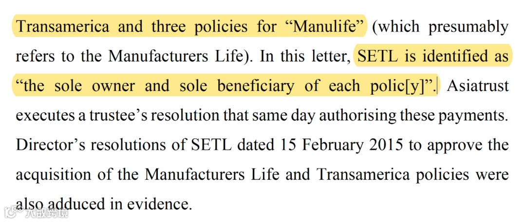 危急时刻,张兰转了三笔合计3,000多万美元(折合人民币约2亿+)资金到两家保险公司宏利和全美的账户,用于购买保单(保单持有人和受益人都是信托架构内的公司SETL),对于这几笔保费转账,新加坡法院并未支持CVC的追偿。