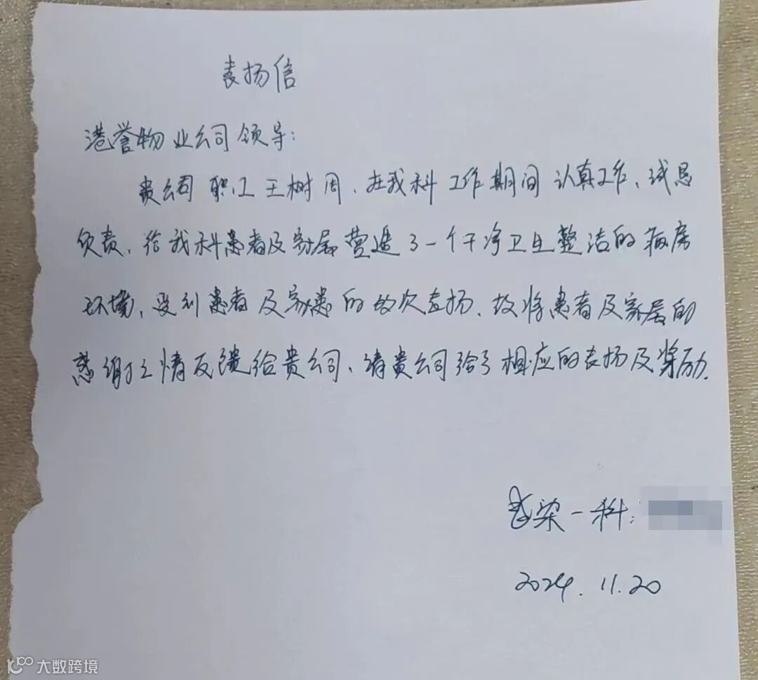 近期,港誉物业医疗事业部还收到了河北医科大学第三医院感染一科护士长的手写表扬信,信中表扬了