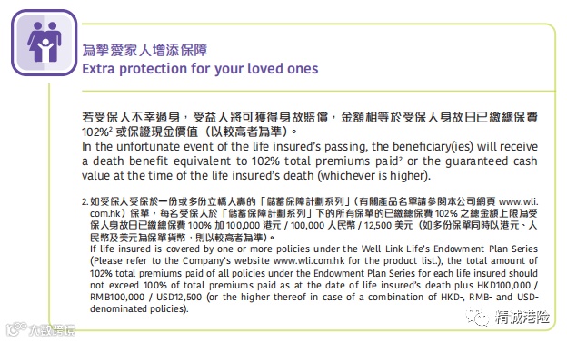 立桥人寿「喜盈于息」若受保人不幸过身,受益人将可获得身故赔偿,金额相等于受保人身故日已缴保费102%或保证现金价值(以较高者为准)。
