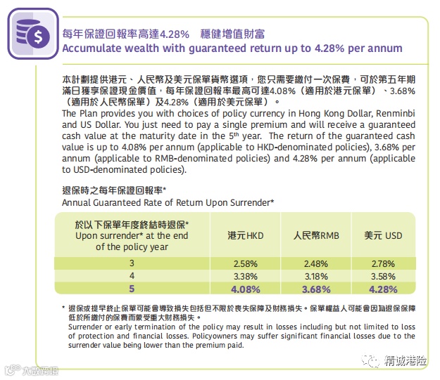 只须缴付整付保费,锁定 5 年保证回报。本计划提供保证现金价值、危疾保障、身故及意外身故保障,5 年期满即可享有每年平均保证回报率高达 4.28%(美元保单),助你稳健增值财富。