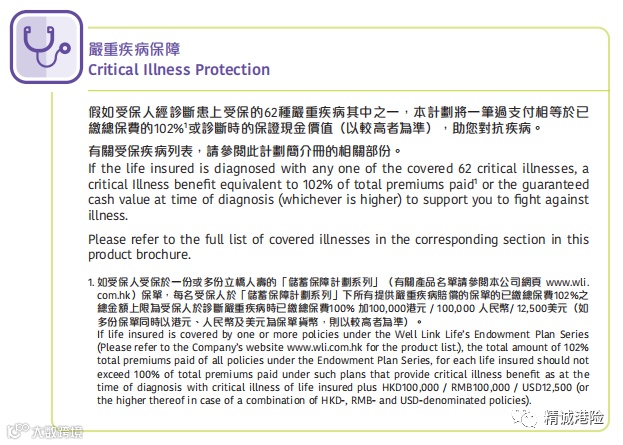 立桥人寿「喜盈于息」严重疾病保障相等于已交保费的102%或受保人诊断严重疾病时的保证现金价值(以较高者为准)。