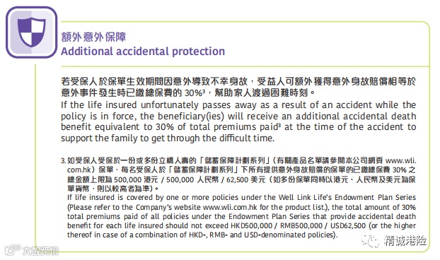 立桥人寿「喜盈于息」若受保人于保单生效期间因意外导致不幸身故,受益人可额外获得意外身故赔偿相等于意外发生时已缴总保费的30%,帮助家人度过困难时刻。