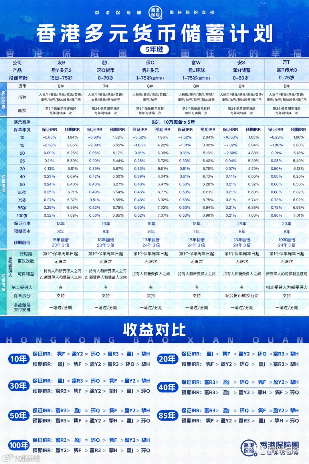 「隽富」包含6种保单货币,包括美元、港元、人民币、澳元、加元、英镑的产品。比起市面上其他多元货币计划,最突出的优势是设计了「开枝散叶选项」,从第5个保单周年日起可以不断地分拆保单,更弹性地管理和传承财富。在回报方面,「隽富」的预期回报比自家的「隽升II」更高,更是领衔同业。