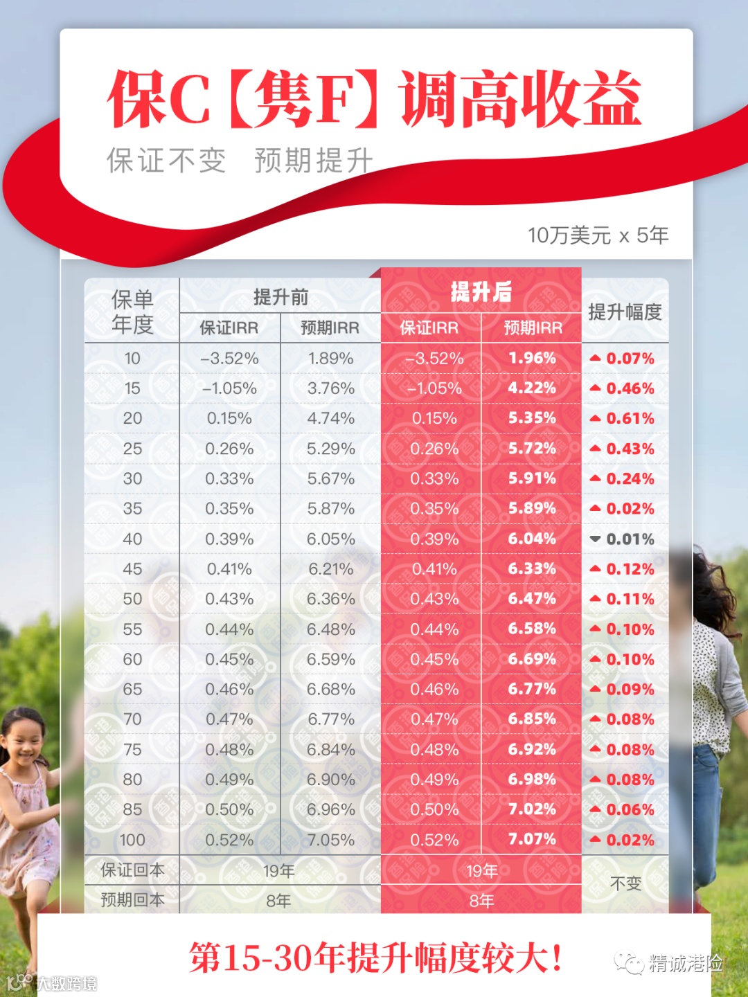 4月保诚上调了部分分红计划的预期收益,包括「隽F多元货币计划」、「特级隽S储蓄计划2」、「危疾加H保3」等,特别是大单频出的产品「隽F」,上调预期收益后(图1),前期预期收益上调最高0.61%,领先同业,具体如图3。