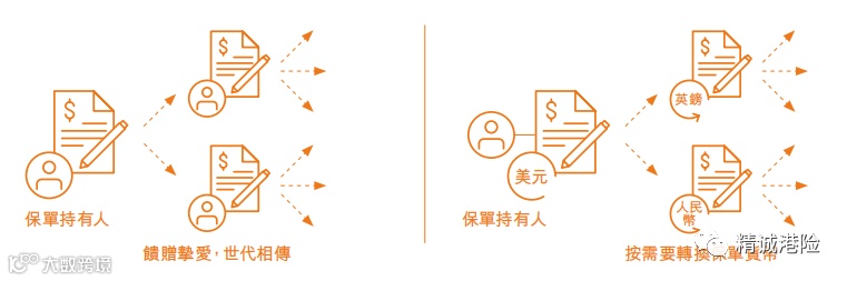 2、开枝散叶选项:可不断分拆保单。第5个保单周年日起,每年可行使1次。配合更换保单持有人和受保人,保单可分配给多位挚爱;配合货币转换选项,财富可以分配至多种货币;