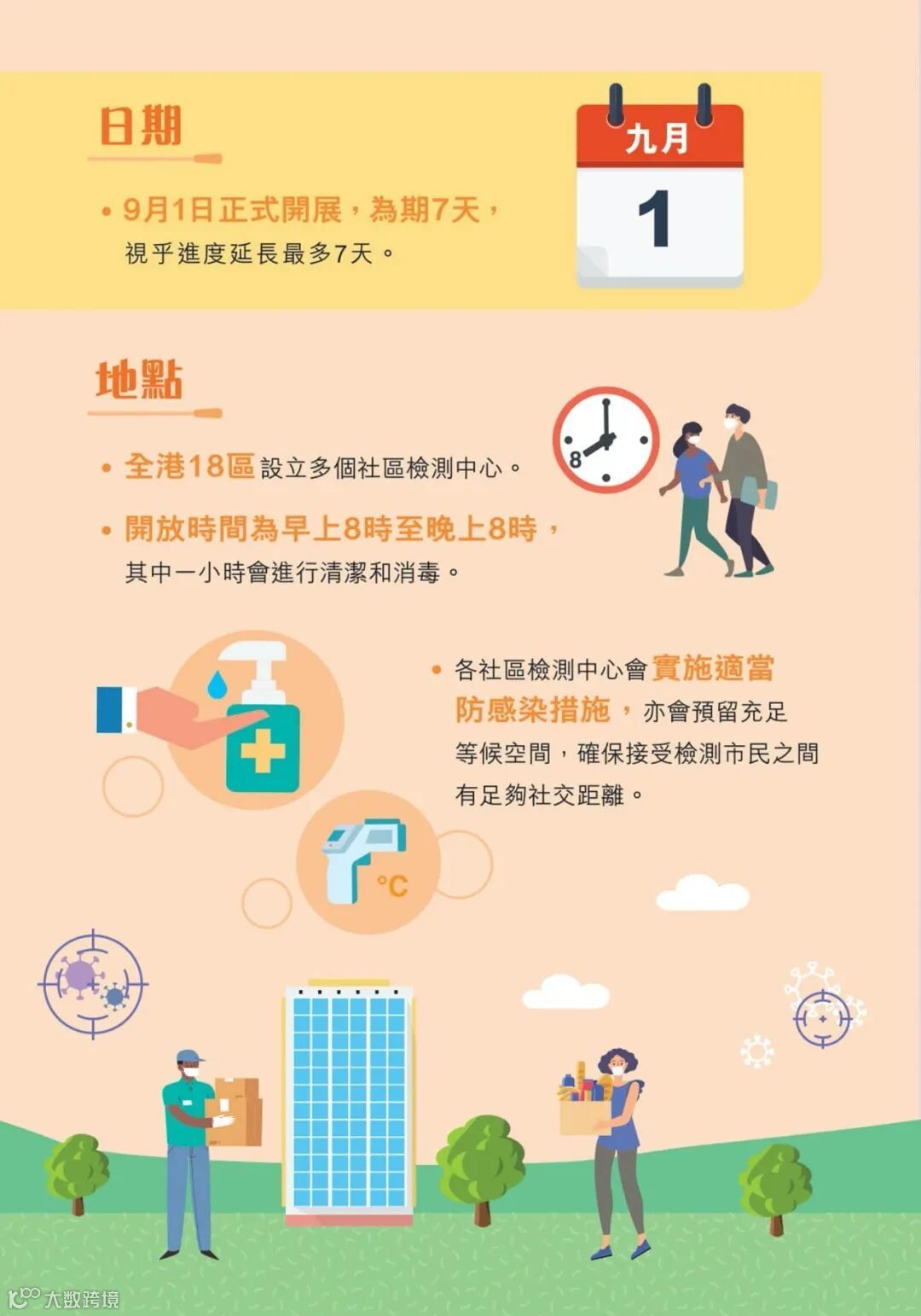 每个社区检测中心会因应规模及人手设定每小时可采样人数的上限,亦会预留充足等候空间,确保受检市民之间有足够社交距离。社区检测中心的开放时间为上午8时至晚上8时,当中有一小时(下午1时30分至2时30分)会关闭以作清洁及消毒,而工作人员亦会有足够装备及采取适当措施,以减低病毒传播的风险。