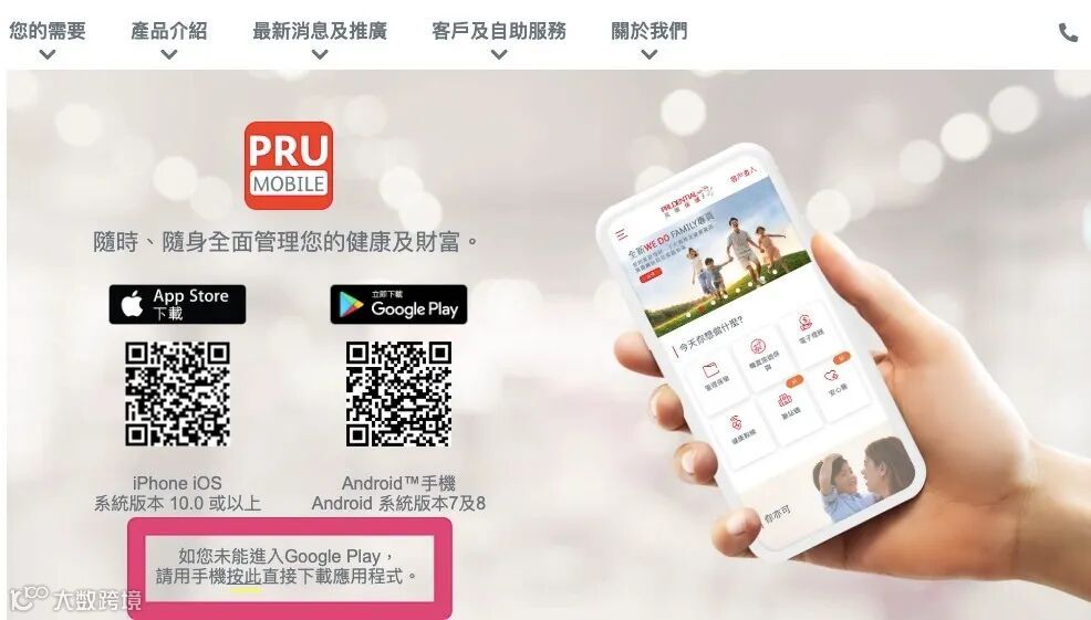 之后点击粉红框中的"按此“,直接进入下载链接https://www.prudential.com.hk/prumobileAPK/。