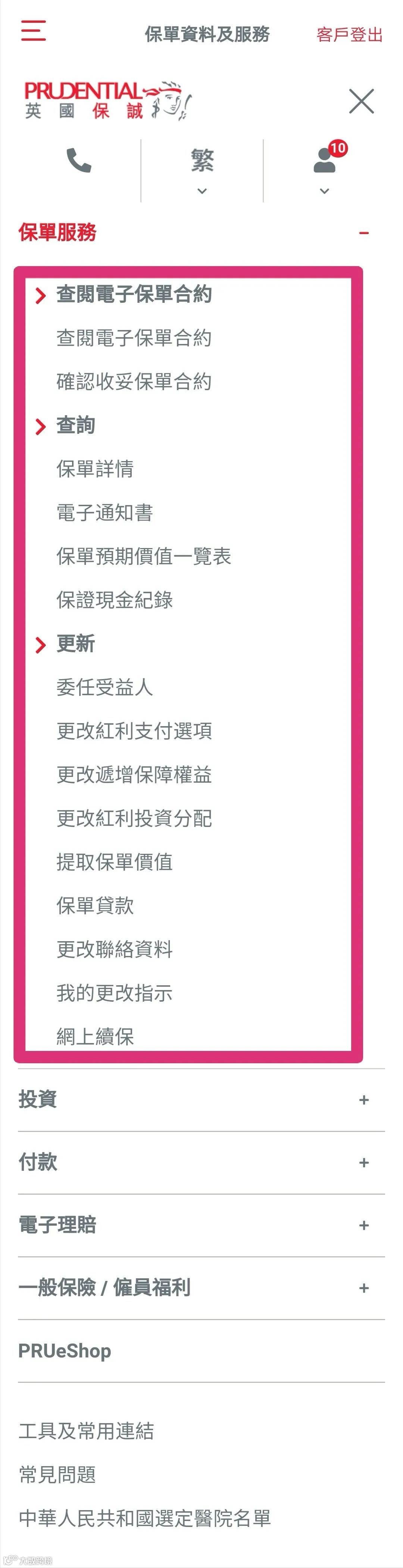 可以查看或处理各项保单服务: