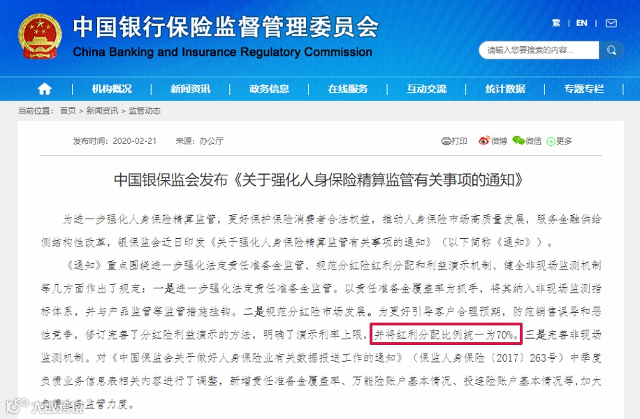 但有销售人员利用“不低于”来夸大收益,从而产生较多的销售纠纷。因此,2020年银保监会重新下发了《关于强化人身保险精算监管有关事项的通知》,要求演示的红利分配统一为70%。