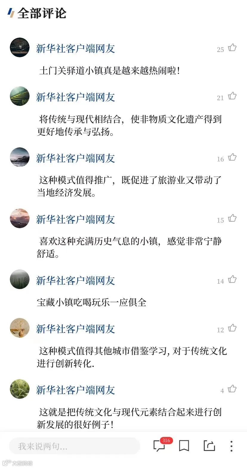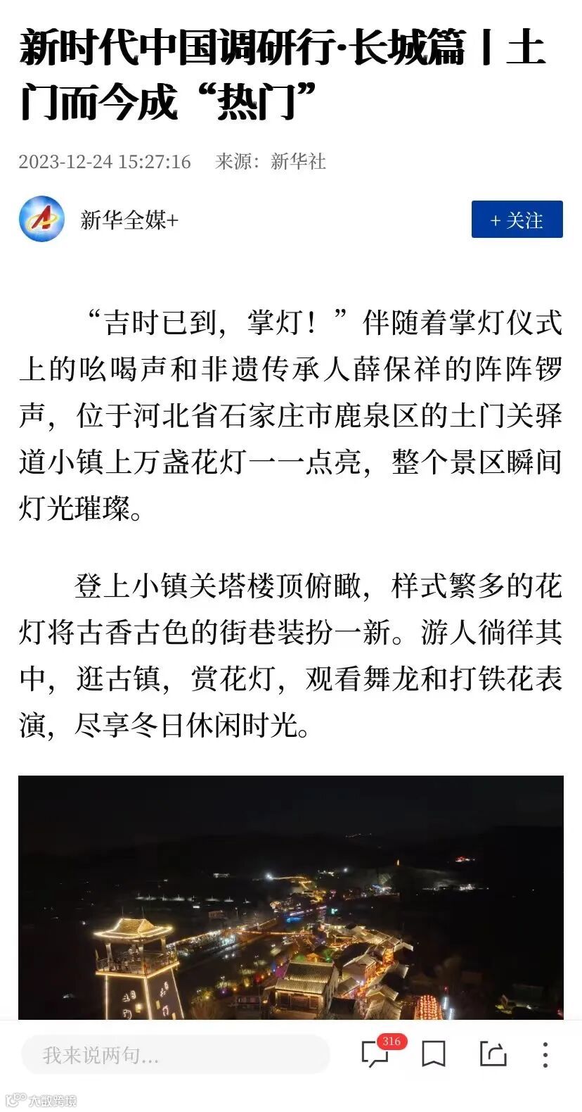 2023年12月24日,新华社就东胜·土门关驿道小镇进行了特别报道,聚焦土门关风土民情,探究小镇文旅融合。稿件一经发出,迅速收获了众多网友的点赞:“将传统与现代相结合,使非物质文化遗产得到更好得传承与弘扬。”“这种模式值得推广,既促进了旅游业又带动了当地经济发展。”“宝藏小镇吃喝玩乐一应俱全”……近130万的阅读量,充分见证了东胜·土门关驿道小镇发展的古韵新貌。
