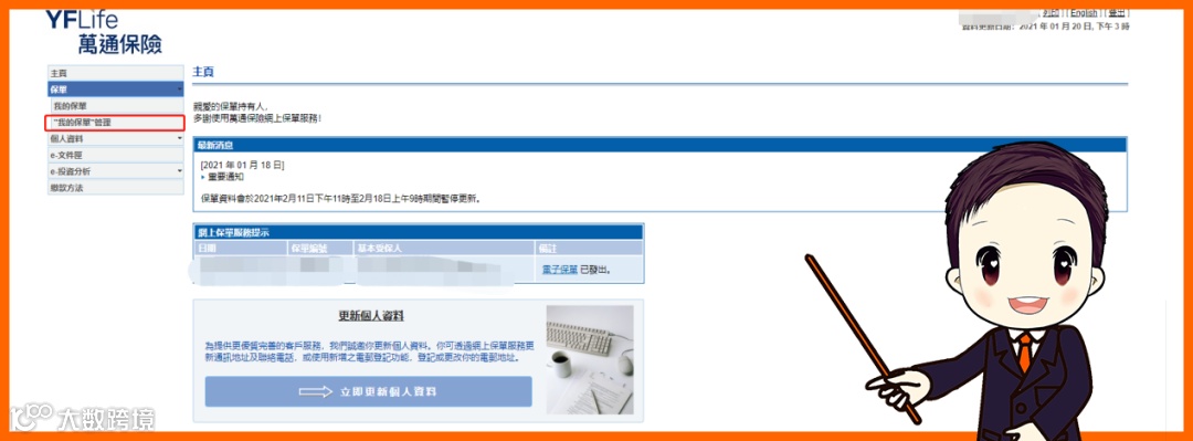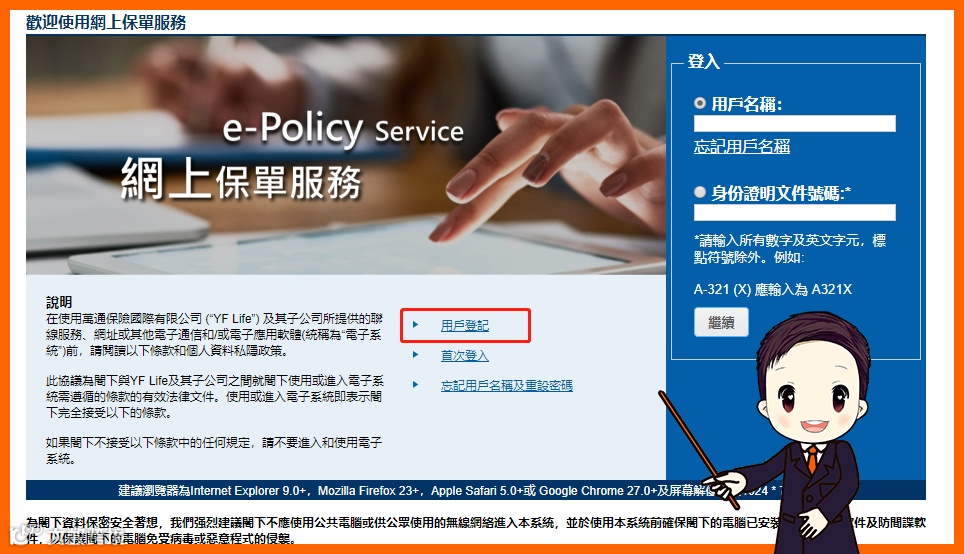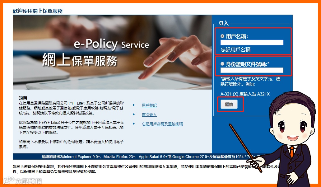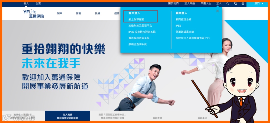 1、登入 https://corp.yflife.com/tc?setRegion=MC,从以下界面登入客户专页