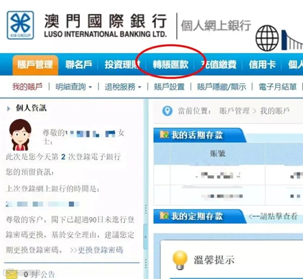 部分客户习惯用电脑,可以通过网银转账,澳门国际银行也可以在网上操作。