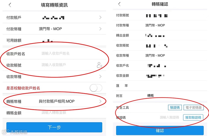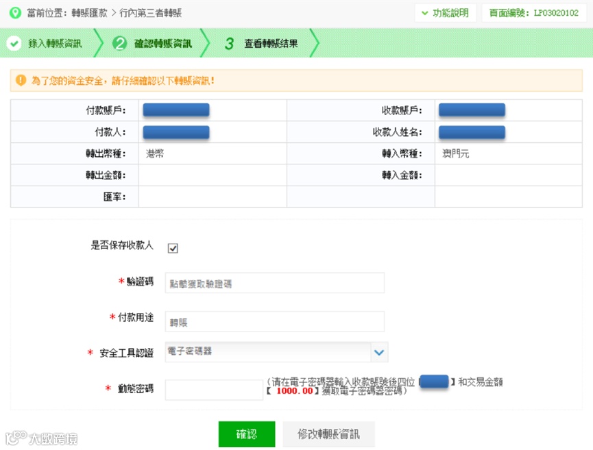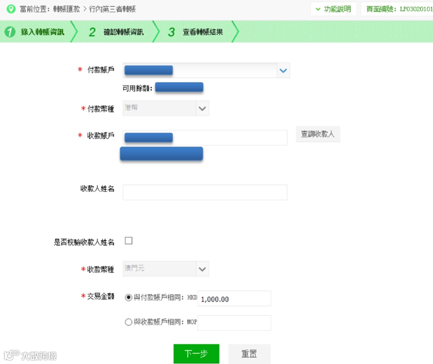 账户号码:10015-200005-1(港币)/10021-000389-9(美元)/10015-100006-6(澳门币),付款账号与收款账号的币种一致,例如付款币种是港元,收款账号也选港元。