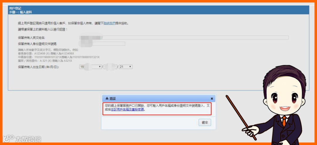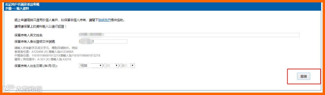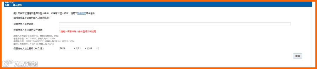 4、按照步骤填写即可,需要记住的是:第1项是填写保单持有人的姓名拼音,姓与名中间需要空一格,输入身份证号码后选择保单持有人的出生日期,点击继续进入下一步。