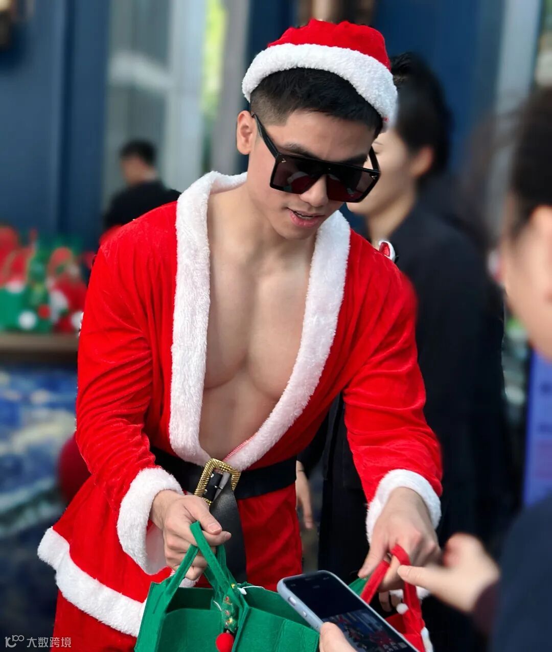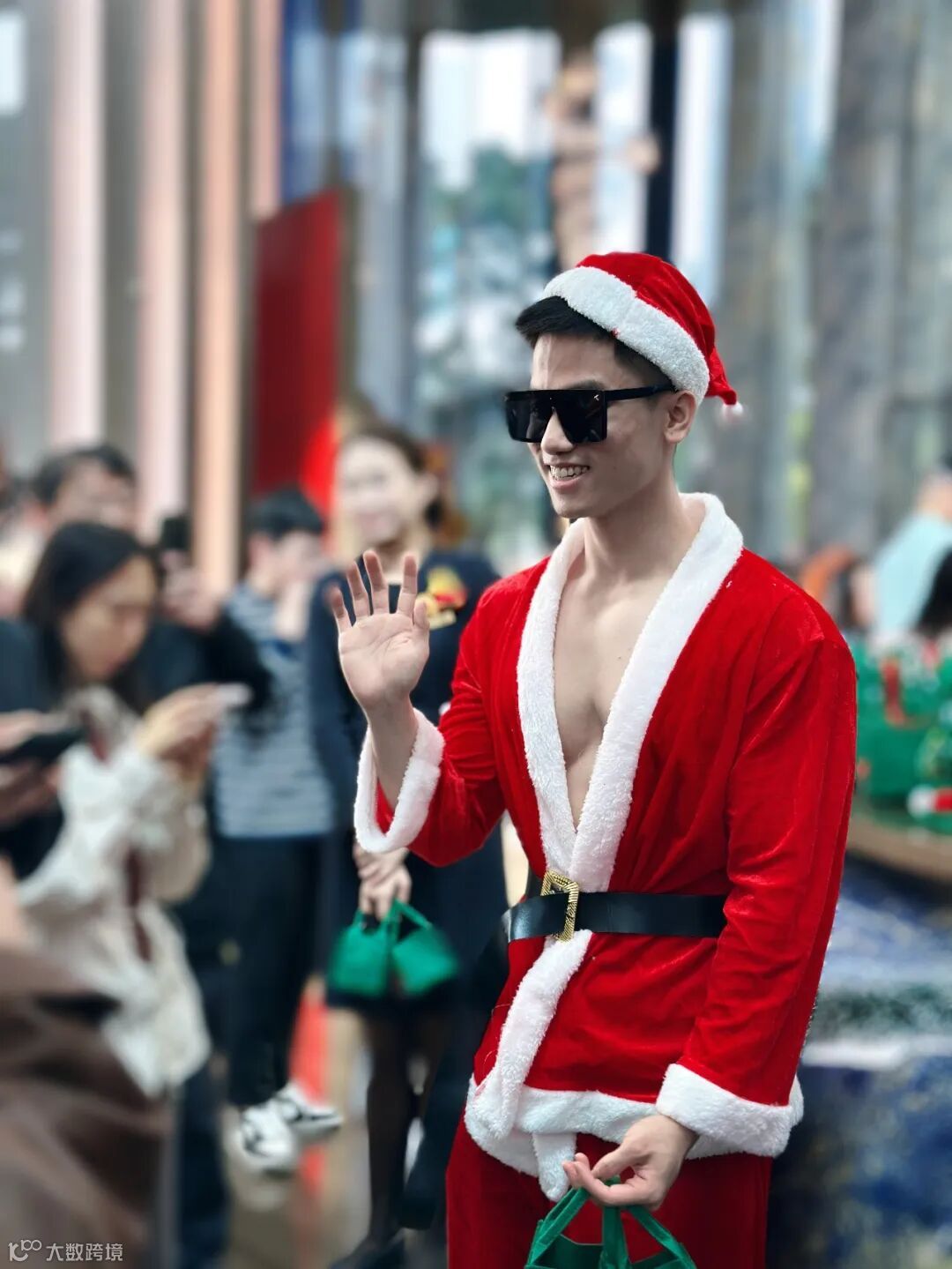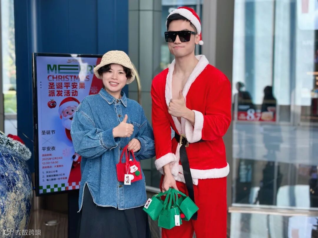 可爱帅气圣诞老人身着经典红袍惊喜出现,大家瞬间被吸引,纷纷领取苹果并合影打卡。