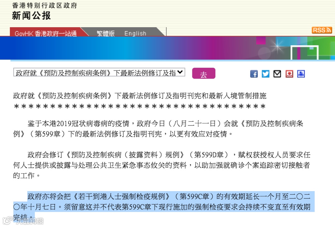 政府宣布,要求隔离检疫14天的“强制检疫令再延长一个月,直至10月7日。但是小编留意到,政府此次发布的公告中,特意加上了一句话,似乎在暗示内地到港强制隔离的要求会在提前结束。