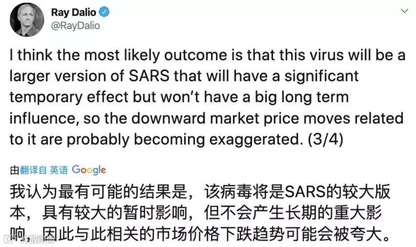 昨天桥水达利欧在推特上发帖,他认为:“我认为最有可能的结果是,这种病毒是SARS的一个更大版本,将会产生重大的暂时影响,但不会产生很大的长期影响,因此,与疫情相关的市场价格下跌可能变得夸大了。”
