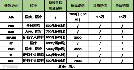 友邦在隔离赔偿的基础上,额外搭配一笔过诊断赔偿和身故赔偿。AIA、MANU、FWD和BOC提供隔离赔偿。