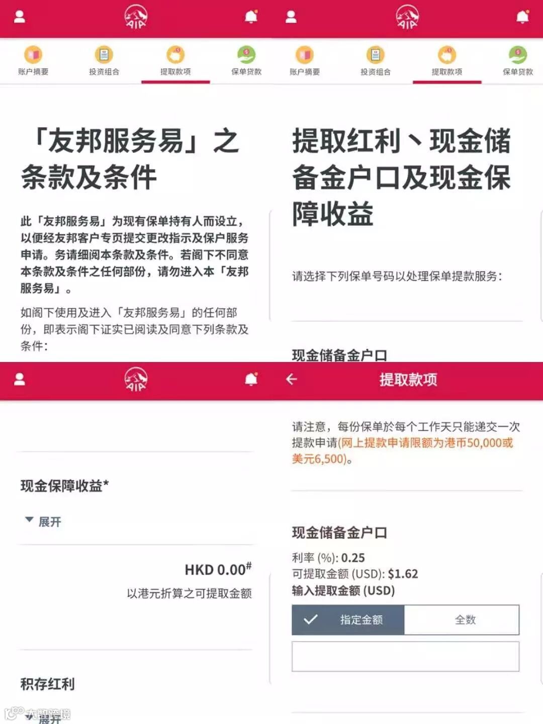进入保单管理自助服务后,可选择提取的金额和提取的货币使用是港币或美元。提交申请后,公司会在四个工作日内把支票给到您的理财顾问。