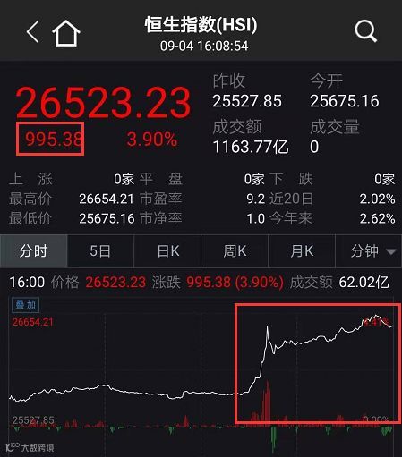4日午后,香港股市出现“大奇迹日”行情,港股盘中突然直线拉升超1000点,站上26500点,涨幅一度超过4%。
