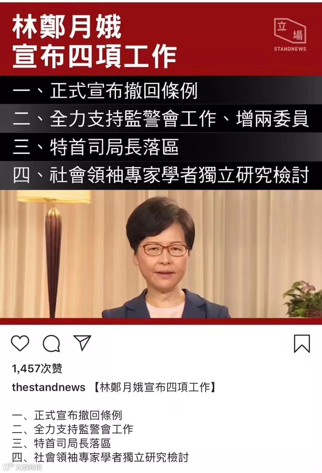 据环球时报报道,林郑月娥今天下午发表谈话,提出四项行动,其中包括正式撤回修改《逃犯条例》的草案。她表示她与特区政府所有司局长将从本月开始与市民广泛对话,一起探讨对各种问题的解决方法。
