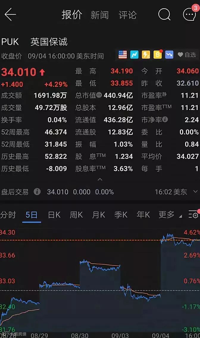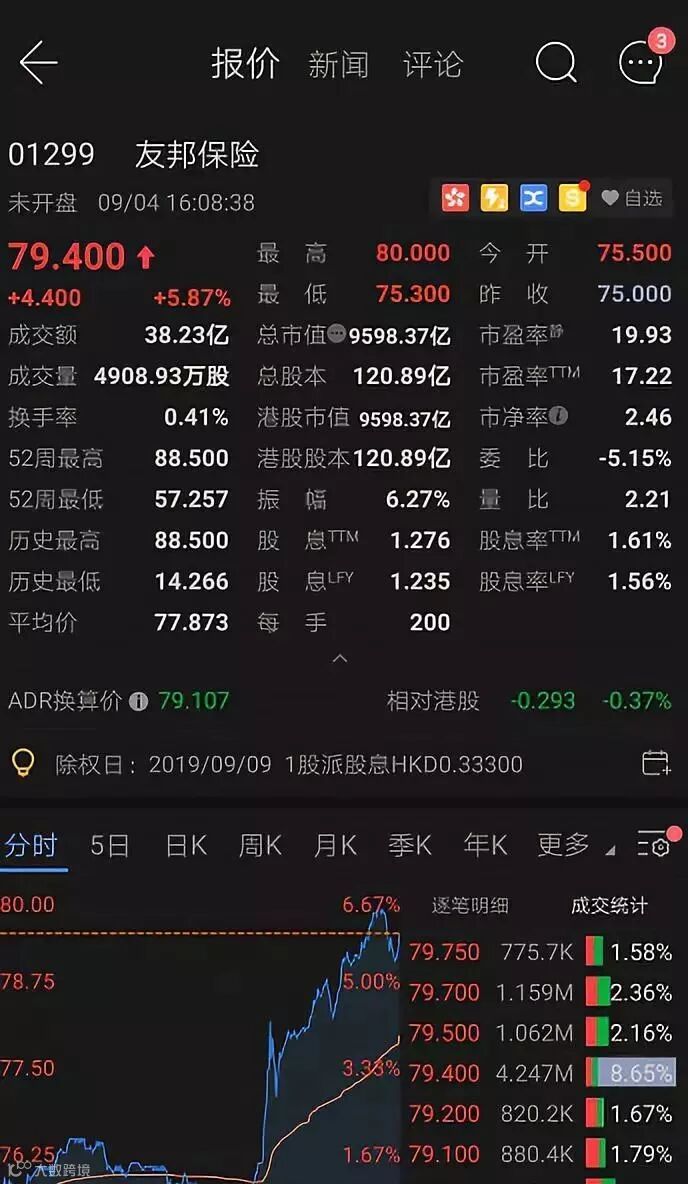 香港友邦股价大涨5%,保诚大涨5%左右...