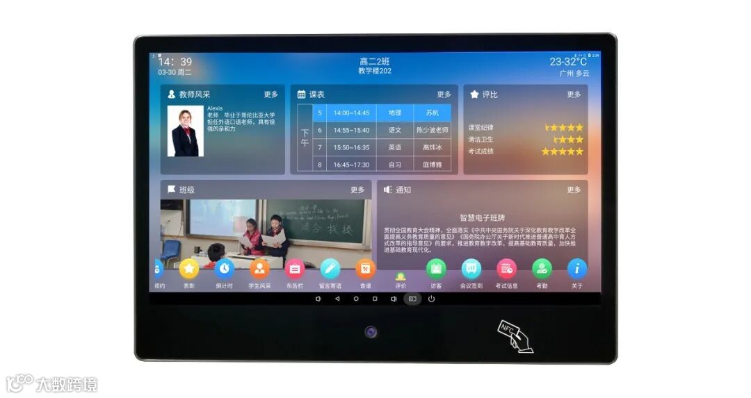 1、教室:在教室门口安装触控电子班牌,可显示班级信息、班主任寄语、班级课表、值日表、班级风采展示、校园通知、校园新闻等。替代传统的黑板报、公告栏,以丰富的多媒体内容格式展示,而且学生还可以通过班牌进行刷卡或者人脸考勤签到,登录个人中心,查看个人成绩、参加各种活动报名、走班选课等。