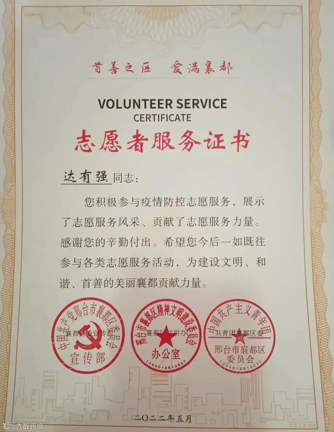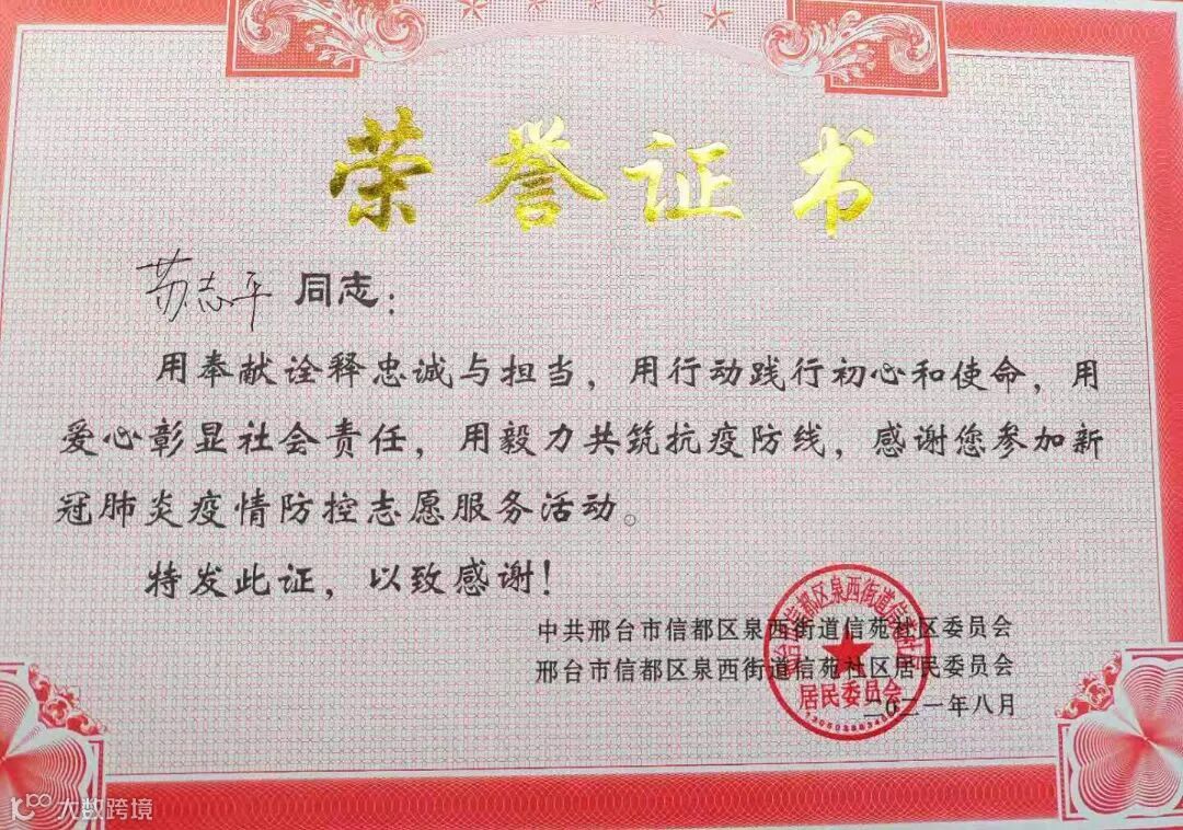 东胜物业紫晶观邸项目(邢台)苏志平、达有强坚守疫情防控一线,用行动践行初心使命,荣获志愿者荣誉证书,诠释着新时代文明实践志愿者的优良风采。
