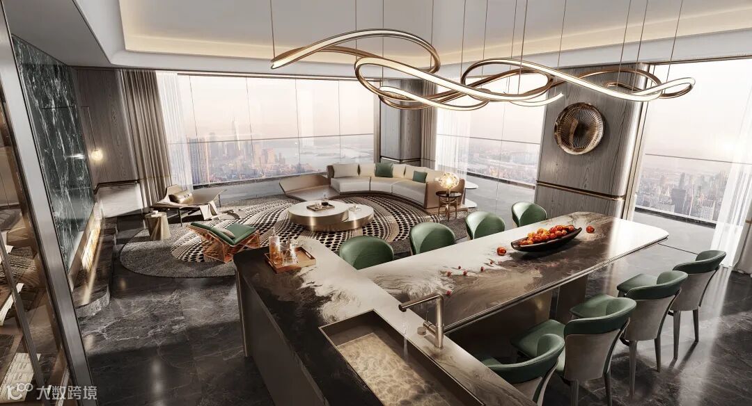 为了更大化城央的景致,东胜·天御多次考察,数易其稿,以LDK+B无界横厅,将客厅、餐厅、厨房一线贯通,搭配落地玻璃窗设计,营造一处面积约100㎡的名门宴会主场。